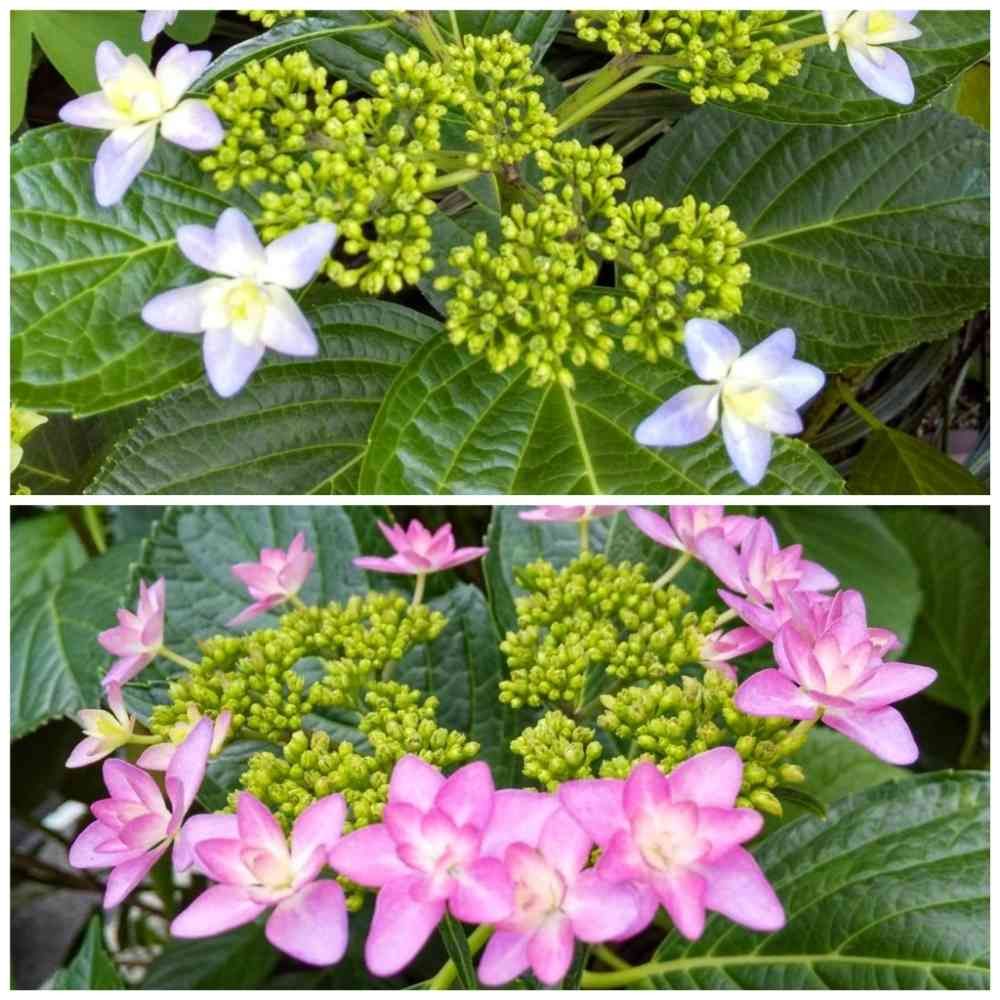 青い八重咲きガクアジサイとピンクの八重咲きガクアジサイの花、随分綺麗に咲いてきました💕🎶