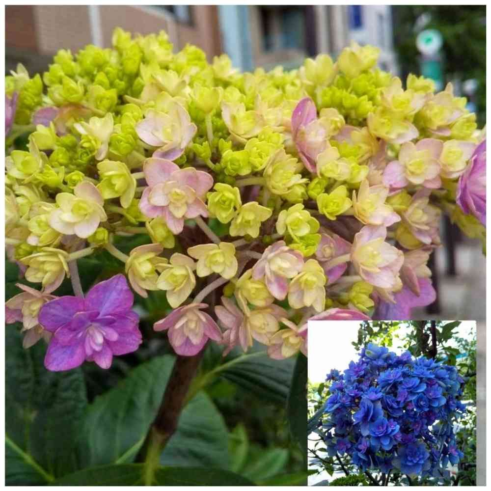 八重咲き紫陽花の二番花、咲き始めのピンクから一日で紫色に変わりました😳