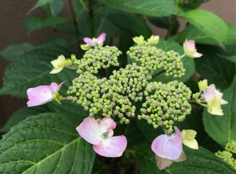 今住んでいる中古住宅の庭に初めから植わっていた額紫陽花で、去年は紫系だったのが今年はピンク系?