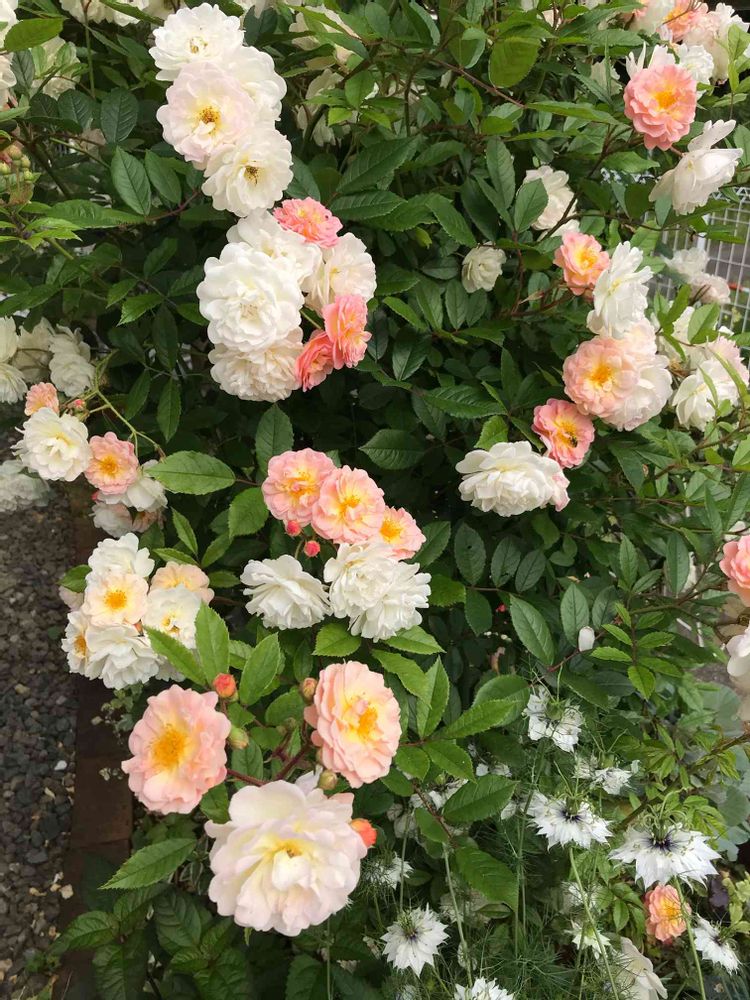 はい、咲きはじめがオレンジからアプリコット→ピンク→白に変わって、ハラハラ散っていきます💕 ブーケのように、たくさん咲いて、いろんな色が楽しめる大好きなツルバラです🤗