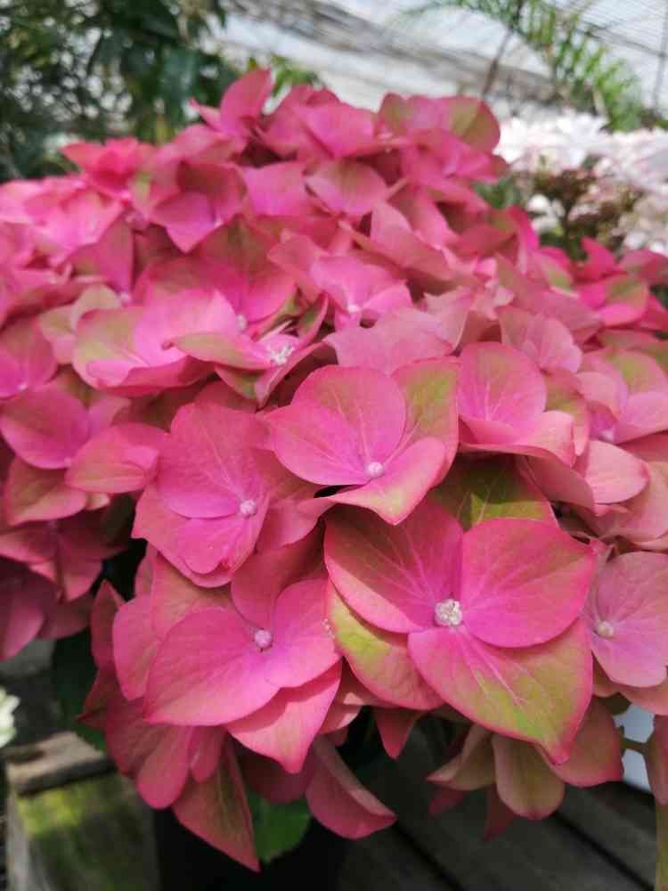 スモーキーがかったピンクの花弁とグリーンのコントラストが魅力のテマリ咲きアジサイで花弁が厚いのも特徴だそうです❣