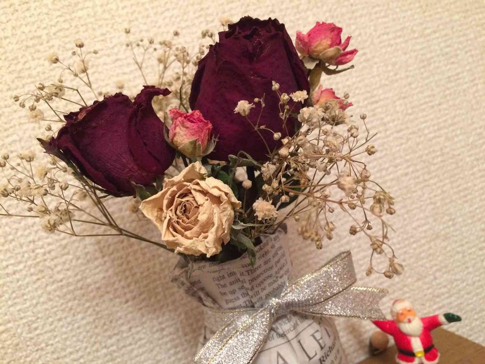 誕生日にもらった真っ赤な薔薇をドライに♡夏に作ったミニ薔薇とかすみ草もまだまだ綺麗(*^^*)