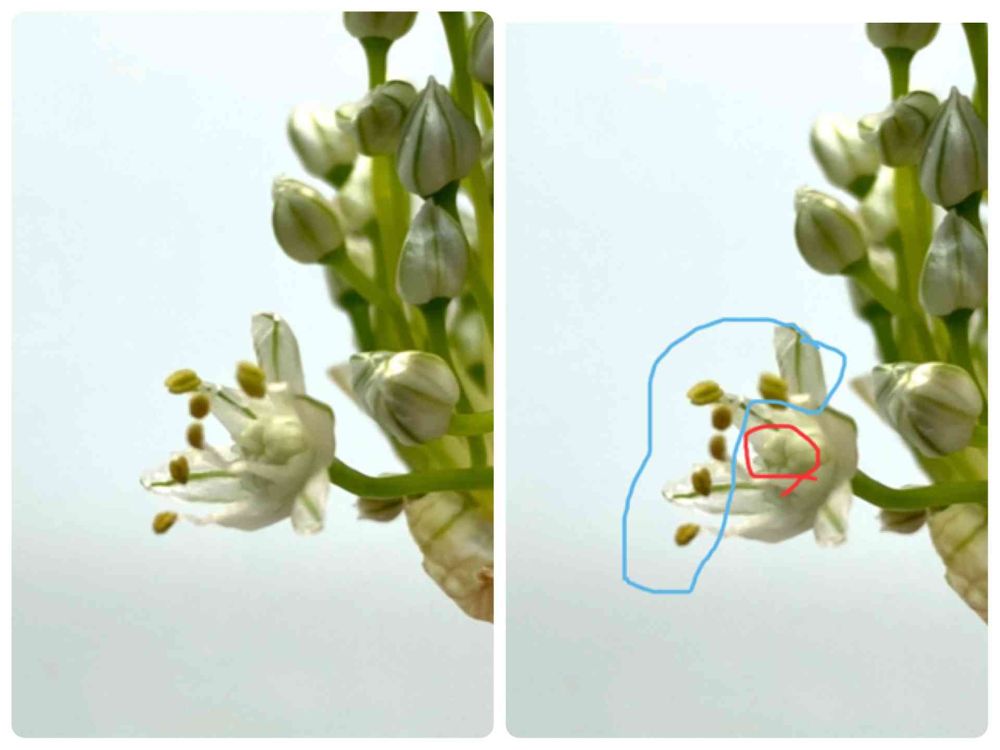 昨日咲いた玉ねぎのネギ坊主さん❣️おそらく…青丸が雄しべで、赤丸が雌しべ🤔花粉を雌しべの先っちょに付けてあげようと思います🥰BABYよっ待っているぞ👼