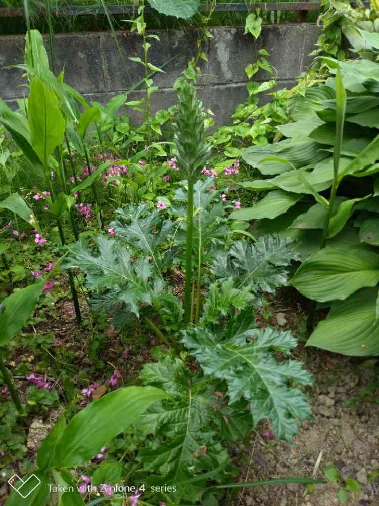 植物をかき分けて、アカンサスモリスを捜索。茗荷谷と擬宝珠に押されながら、花芽を伸ばしていました。(;O;)