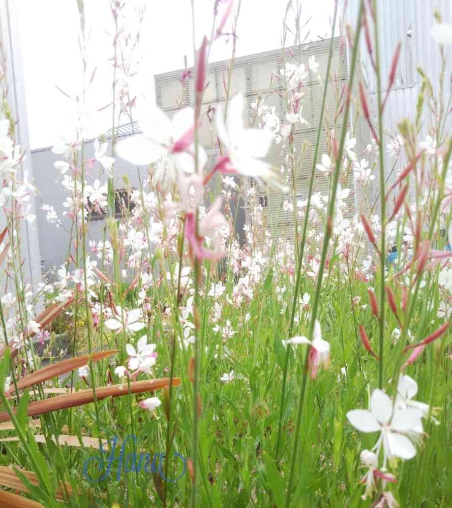 ガウラは白、薄いピンク、濃いピンクと三色咲いてるけれど、濃いピンクは膝くらいなのでうまく収まらなかったの😓