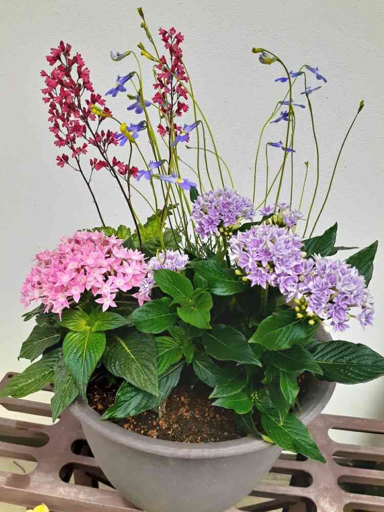 グリーンにピンク、ブルーの色合わせとお花の高低差、良くバランスの取れた素敵な寄せ植えだと思います👍 持ち込めばもっと味が出そうですね😊