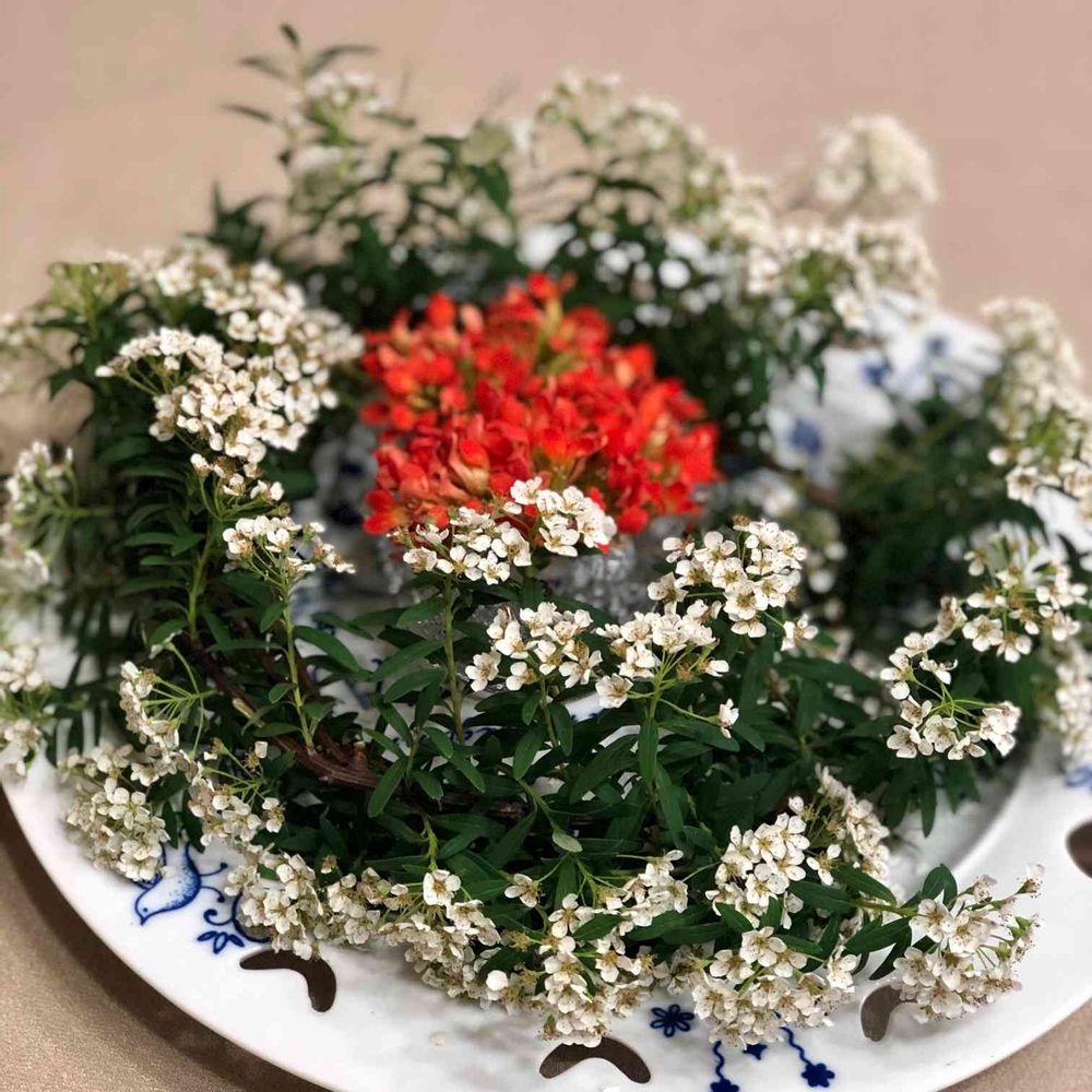 ジャーマンアイリスの奥にコデマリの木があります。アイリスが終わったので、やっと採れるようになったと思ったらコデマリも、もう終わり寸前でした。枝をリースにして、同じく咲き終わりそうなカランコエと一緒に撮りました。
