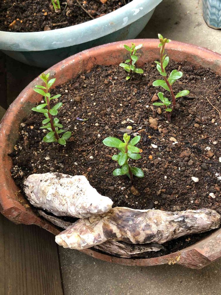 鉢が割れているので、、牡蠣のから土止めてを😅