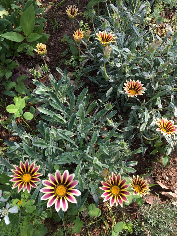 去年寄植えに使っていたシルバーリーフのガザニア✨テキトーに地植えしておいたら一斉に開花しました。