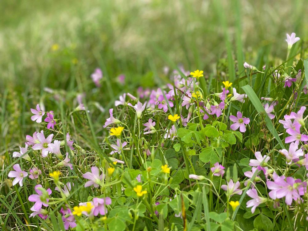 残ったハゲた大地とのコントラストで浮き上がったムラサキカタバミの可憐なピンクとカタバミの黄色に癒された♪