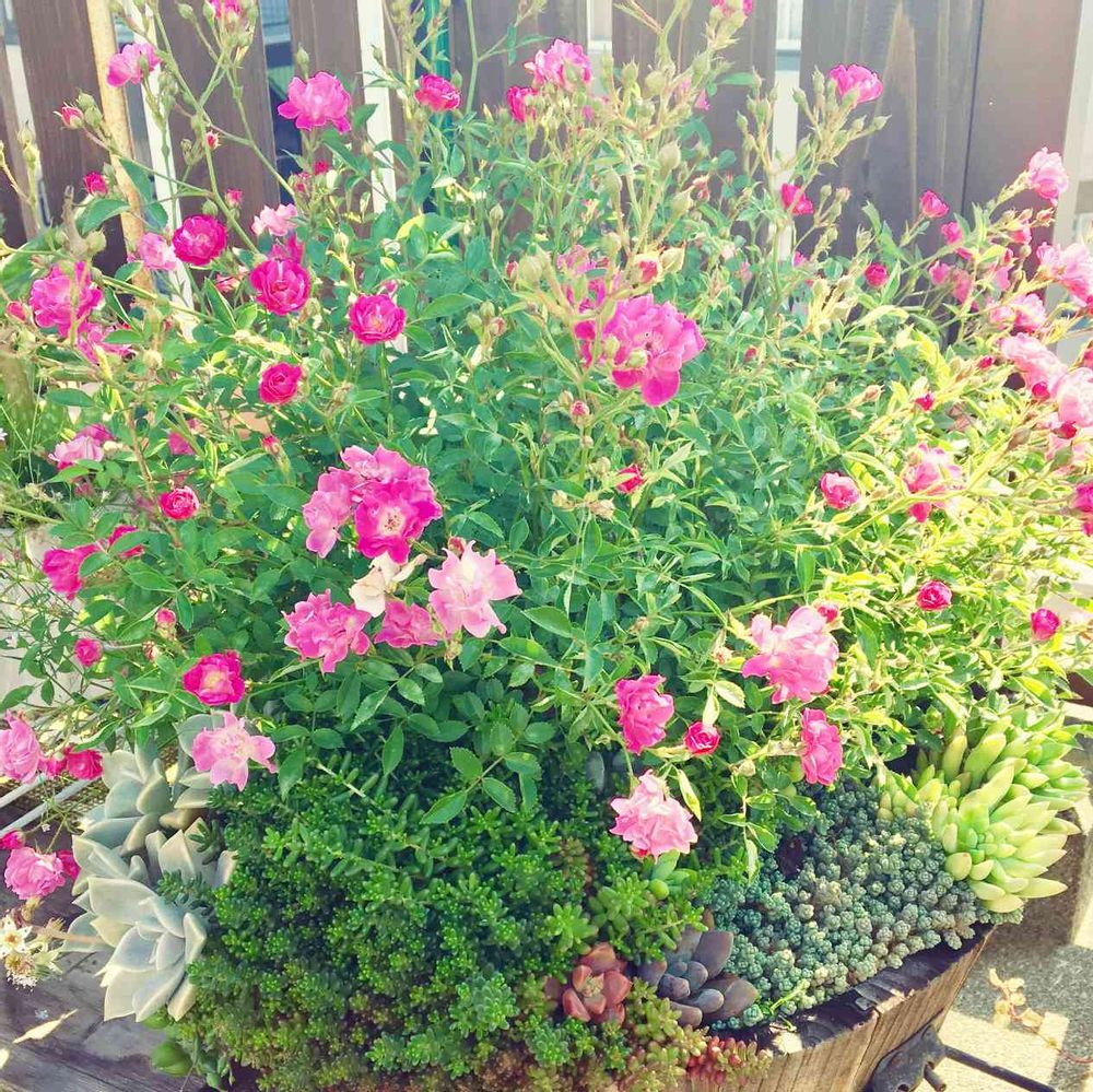 多肉とミニ薔薇の寄せ植えが…