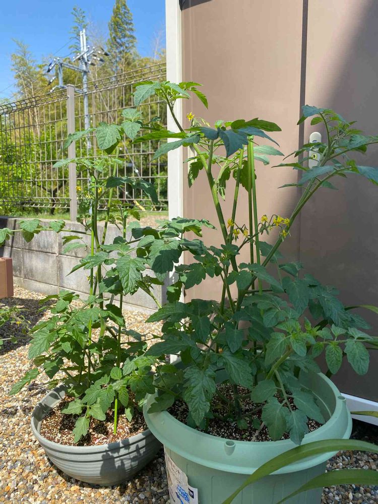 ただ、左のトマトの鉢が大きいのが、家に無かったので、深さが足りなかったのか、右の苗より、成長が悪いです。