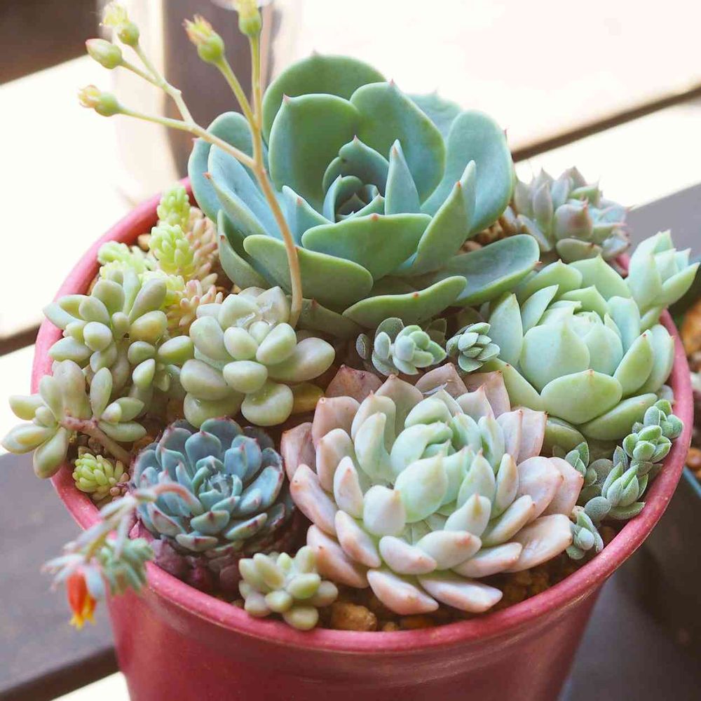 今週の寄せ植えシリーズw 秋にチョンパしてたエケベリアの王様「七福神」がこの春でグッと成長したので主役に抜擢。新入荷のピンクブライトの淡いカラーが花を添えています(*´∀`*) あとスキマに小さいセダムやクラッスラを埋める技を見よう見まねで使ってみた!