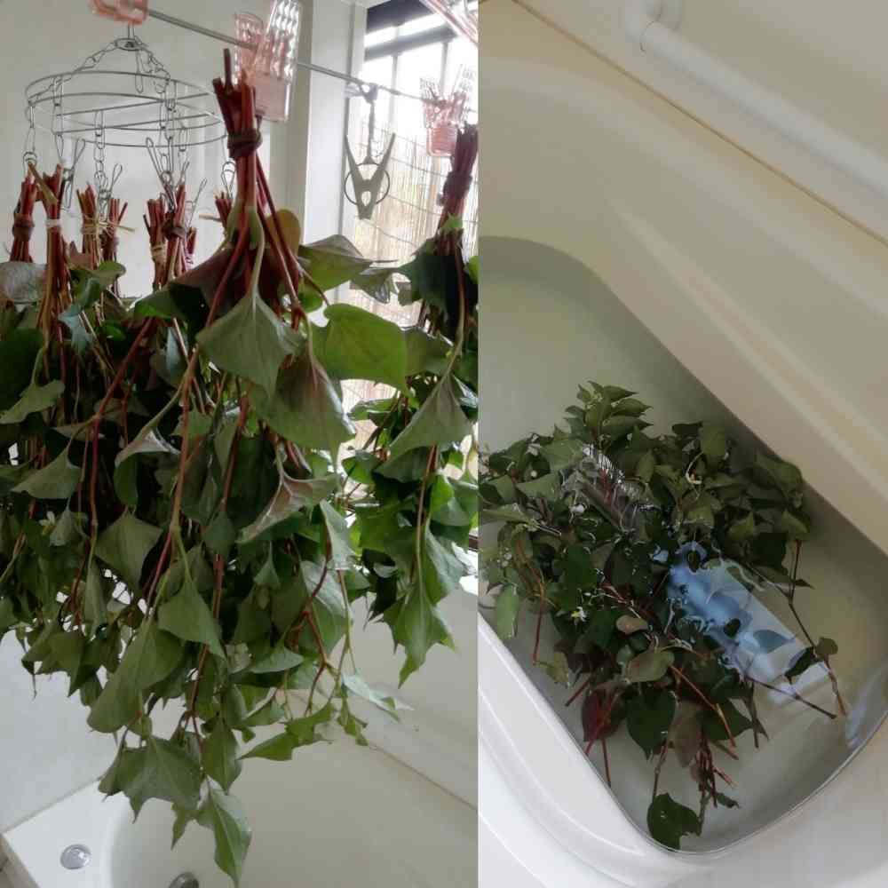 10本ずつ輪ゴムで留めて最後にシャワーでもう一度洗い、逆さ吊りにします。