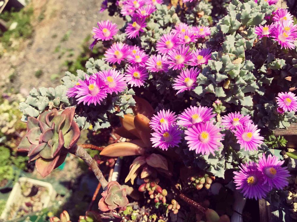 ゴツゴツした多肉ちゃんですが、可愛く丸い花が咲きました😁いつも雨ざらしの庭に放置していますが、スクスク成長中😊