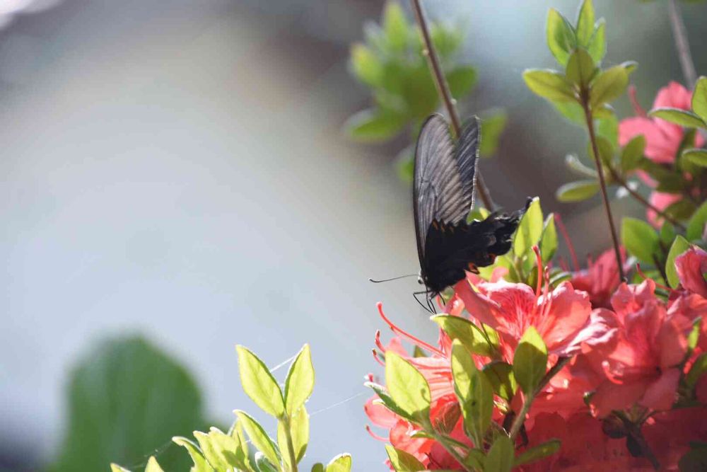ジャコウアゲハかな?黒い蝶がツツジに。