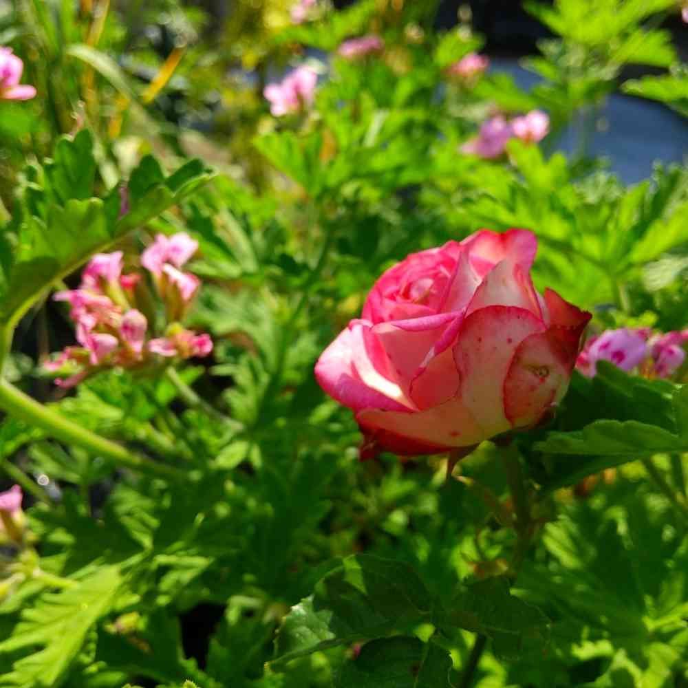 センテッドゼラニウムの中で咲く、鉢植えのミニバラ🌺