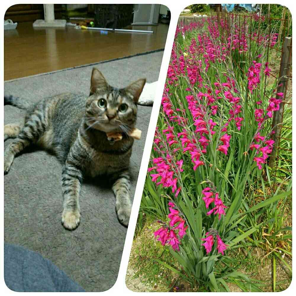 この花はグラジオラスではないし 何て言う花なのか毎年綺麗に咲きます🎵 & 可愛い四女のマリー😼です(。・_・。)ノ💕
