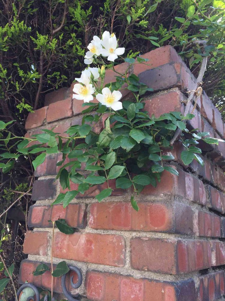 門柱に絡まるランブラーローズ ウェディング・ディ。煉瓦との相性バツグンです♡