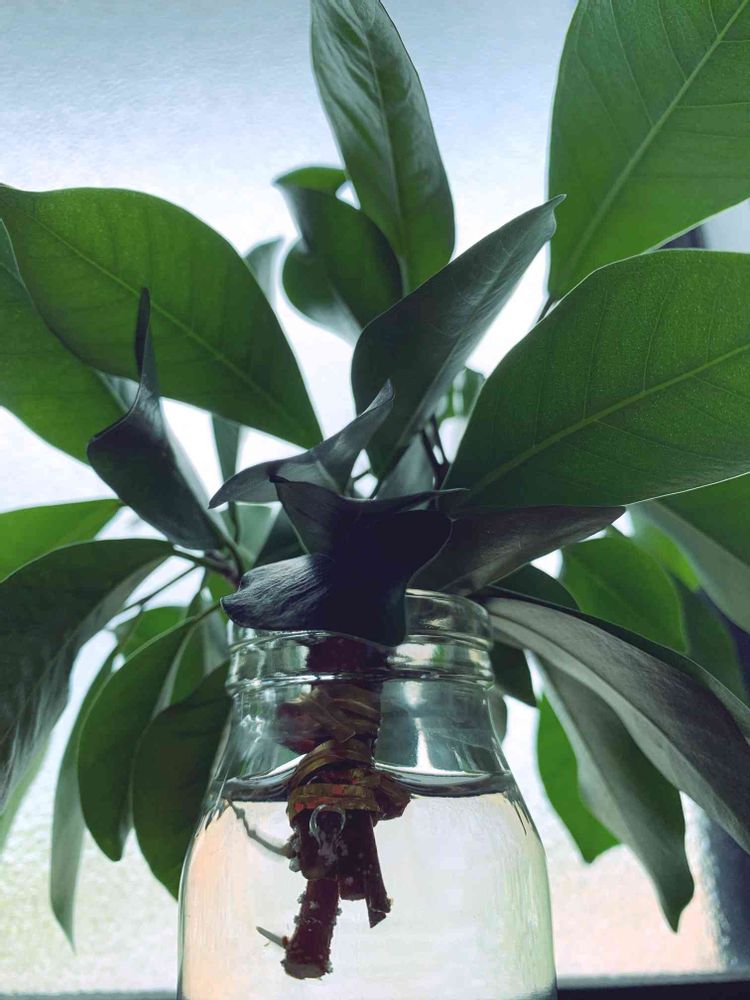ガジュマルの剪定枝が水挿しで発根してます。このまま縛って植えつけて1本に癒着を狙ってみようかな🤔