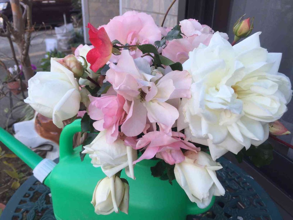 ジョウロで生け花‼️仕立て直しの為に切られたッルバラの花で🌺