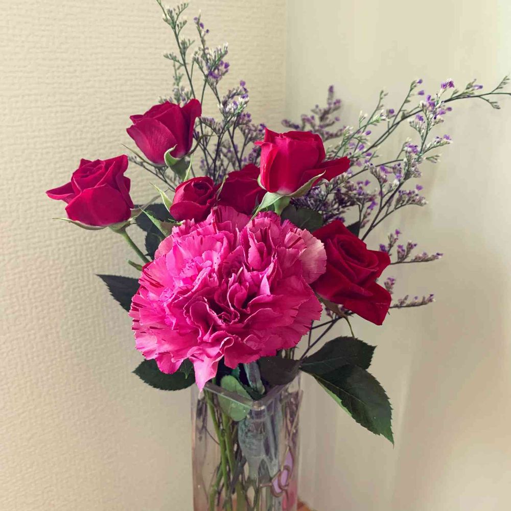 ど定番な感じでバラとカーネーションが届きましたが、やっぱり定番なだけに開けた瞬間「かわいいー💕」と思わず声が出ちゃいますね。