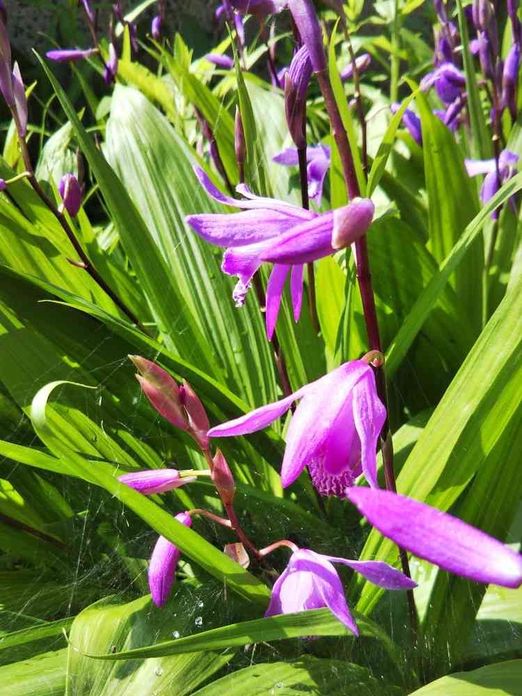 シラン(赤・朱色)、勤め先から頂き10年我が物の顔で増えてます、両隣に白(白・斑入り白)のシランがあり、大河ドラマ(今川・織田・齋藤)の戦いが始まります。