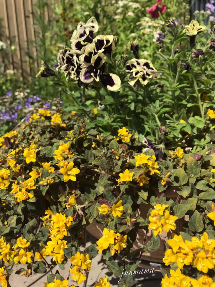 junmamaさんのリシマキア ミッドナイトサン,ペチュニア 花衣 黒真珠,鉢植えの投稿画像