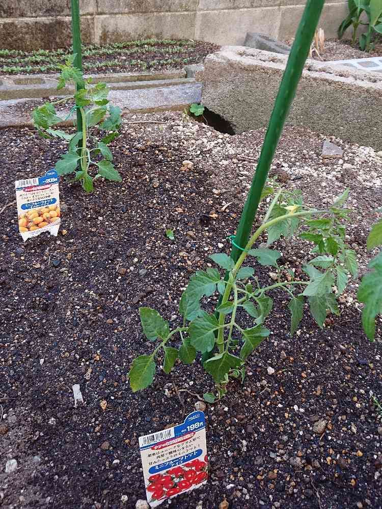 今日、ミニトマト(卵型のアイコ)の赤と黄色1つずつ買い植えました。