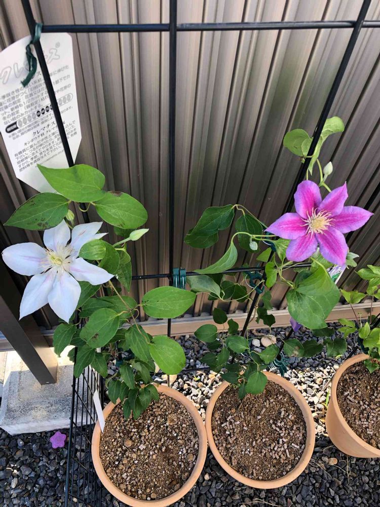 花を咲かせたアンドロメダとレッドパール、横にはまだ小さい蕾の穂高と鶴の舞の4種類のクレマチス🌸 まだ2年苗と小さいけど…レッドパールは届いた時から根元の部分がグニャリと柔らかかったんやけど大丈夫かな? 無事に育って沢山の花々が見れるんが楽しみ😊