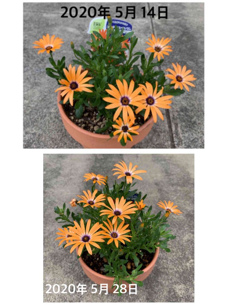 オステオスペルマムは2、3日で花が萎んでいるようです。園芸用ハサミで根元から3〜4㎝くらいのところでカットしています。2週間ごとに咲く場所が変わっているので鉢の中で1番よく咲くのがどこか私もまだわかりません😅まんべんなく咲いてるんでしょうね😊雨に当てないように天気予報を確認して気をつけています