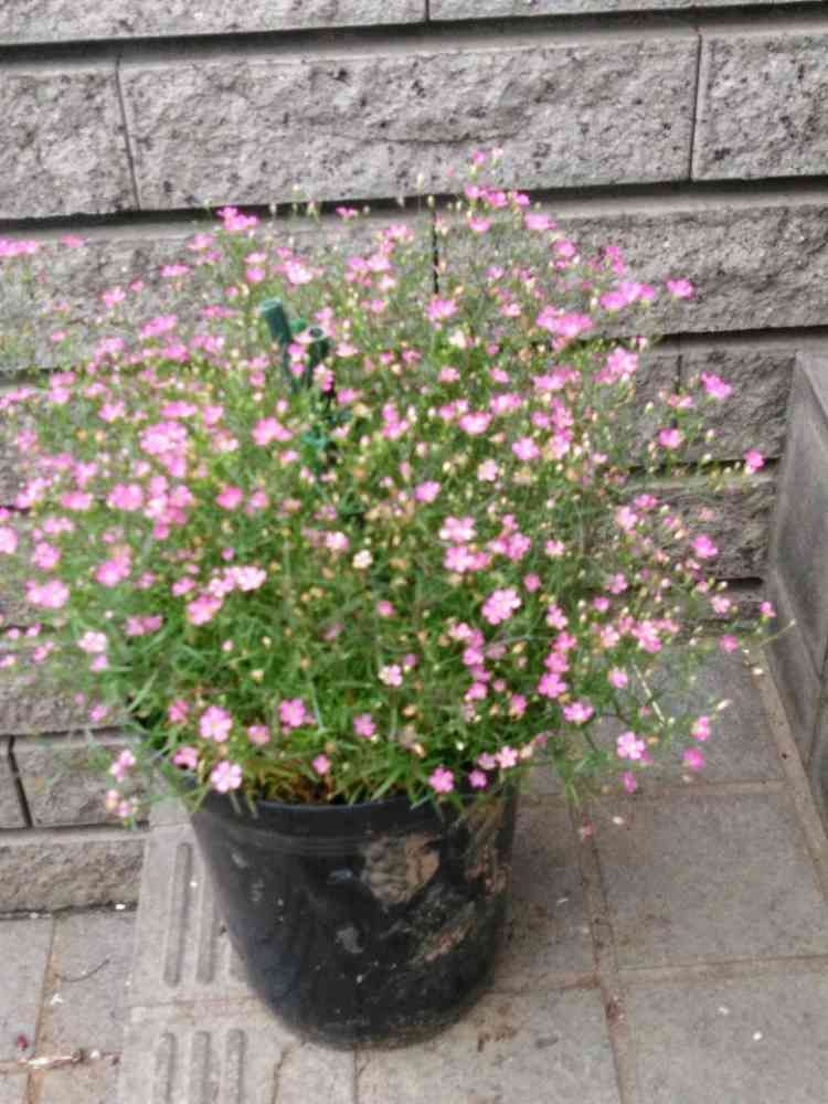 ご近所の花友さん宅の、玄関の階段に、置かれている、ピンクのかすみ草です。