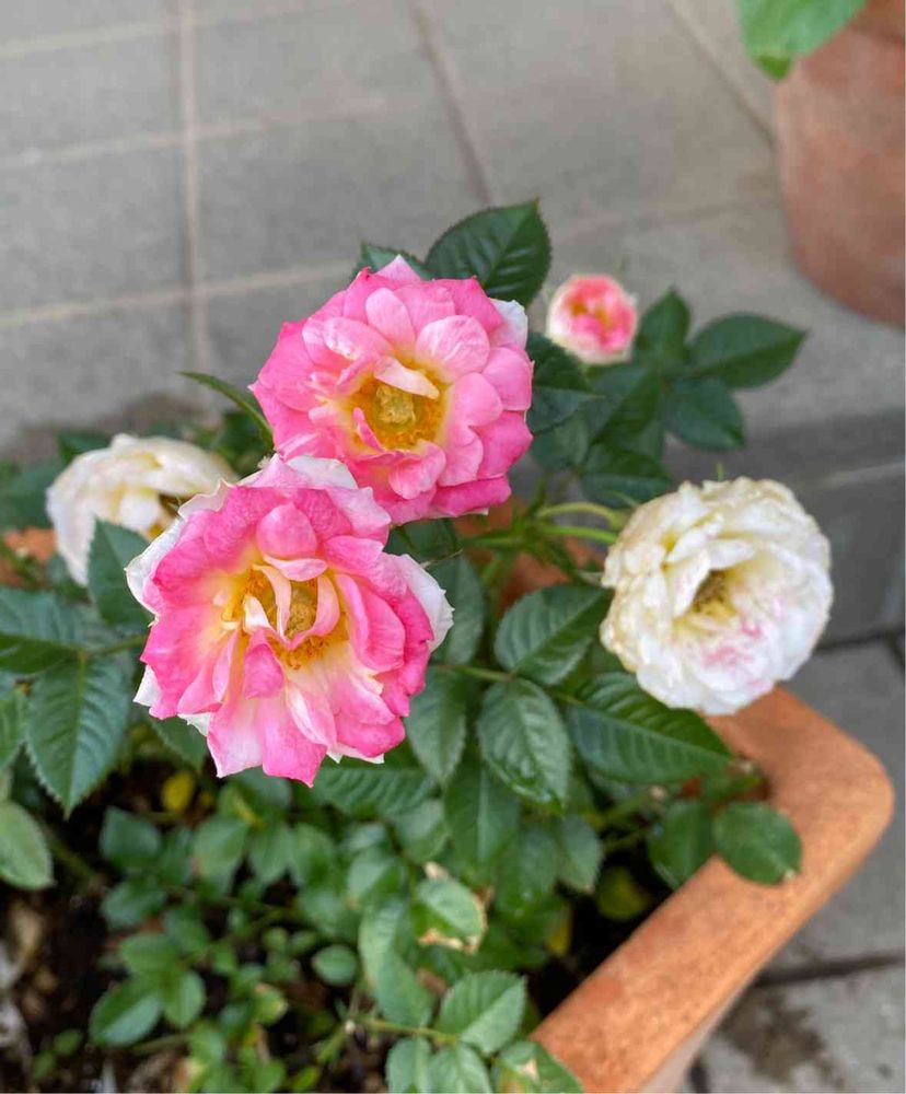 白いミニバラが可愛いな、と思っていたら、突然三つだけ、中の方がピンクの花になりました💕薔薇は不思議がいっぱい🌹