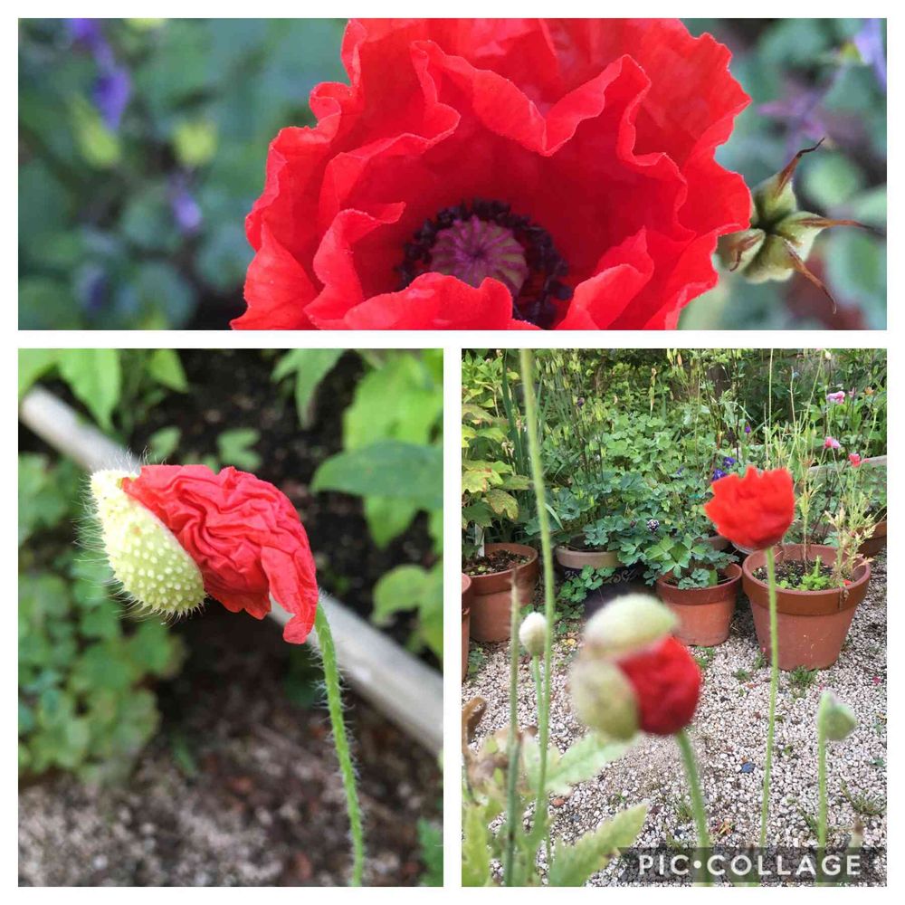 ポピーが殻を押し上げて開花する様子です。❤️❤️❤️✌️