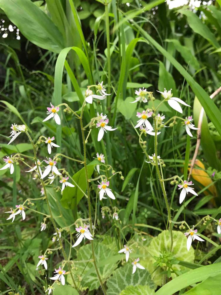 ユキノシタは白色の花だと思ってましたが見るとピンク色の花を付けて咲いていました 白色と思い込んでいました