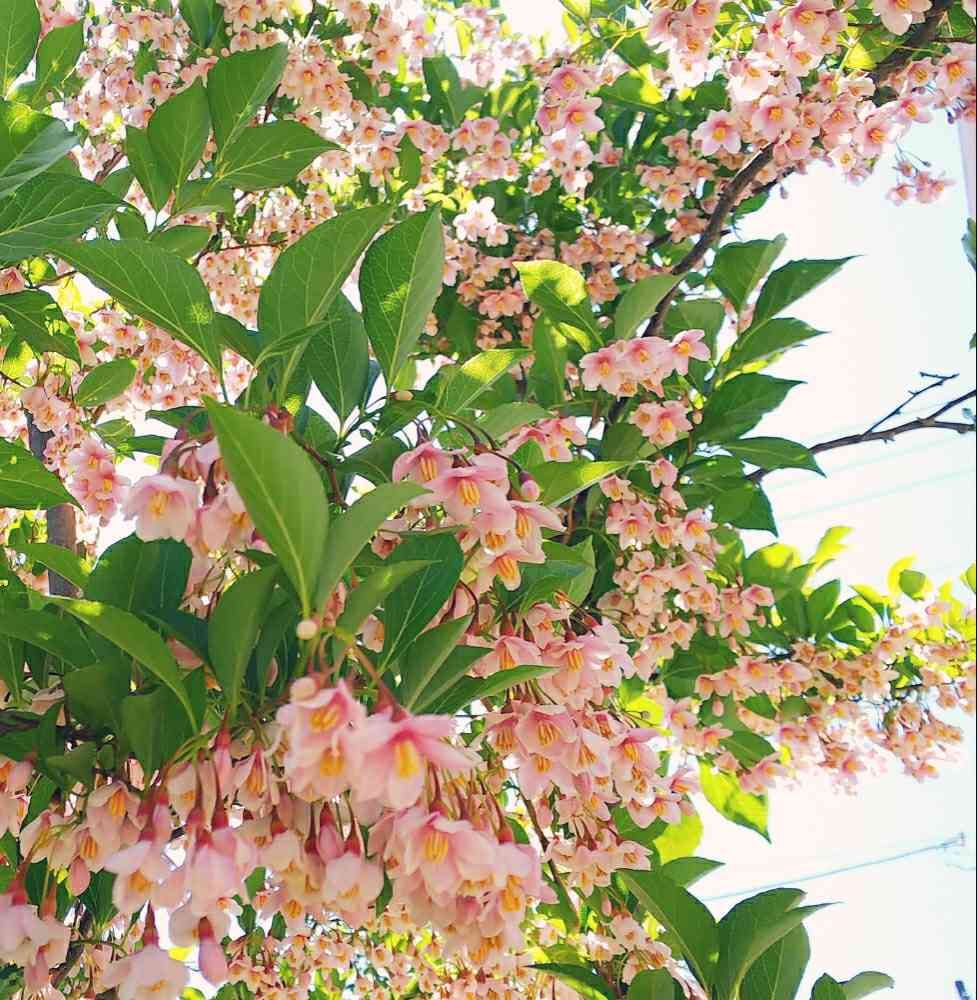 ピンクチャイムの花です。今年は沢山の花が咲きました。下向きに咲く花なので下から撮ってみました。花が終わると黄緑の実をつけるので、今年は素晴らしいツリーになりそうです💕