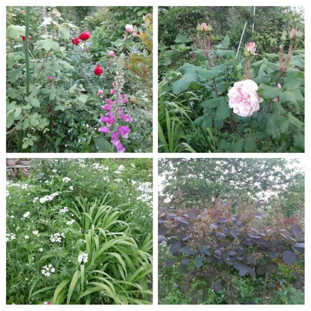 広い庭で咲いてる芍薬、オルレア、スモークツリー、りゅういちと言う名前のバラ
