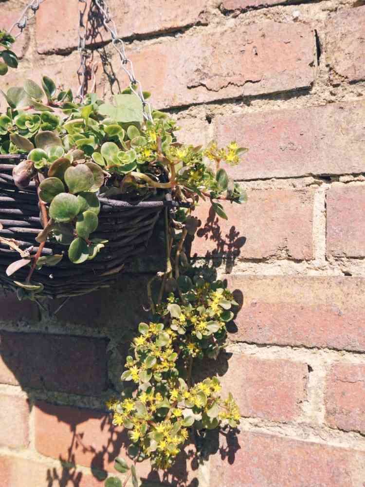 セダムばかりの寄せ植えだと味気なくなりそうですが、花が咲き🌼かごからはみ出て動きがあり、なんたってチェーンで下げられた籠が素敵ですよね✨