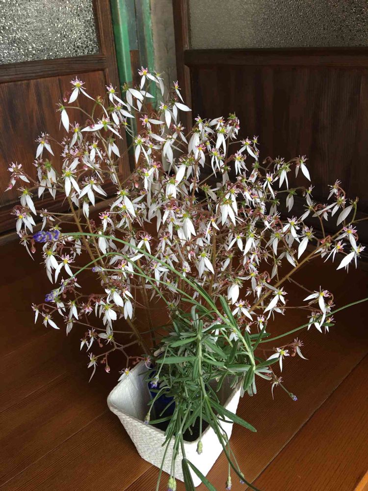 満開のユキノシタを摘み、癖の強い曲がり方のラベンダー達と花瓶へ入れてみました。