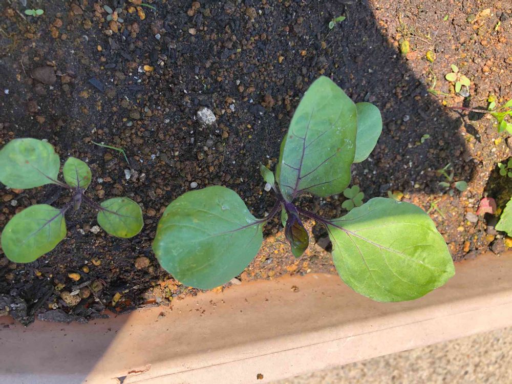 同じ日に種まきした他の野菜たちはもう花がさいてきているのに、ナスはまだまだちびっ子なのね