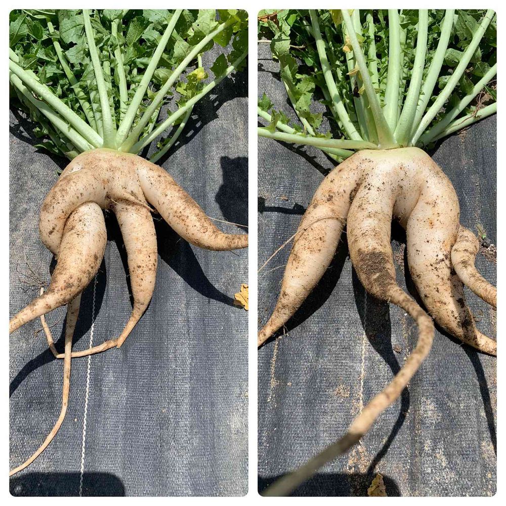 大根収穫したところ、複雑に絡み合った大根が!