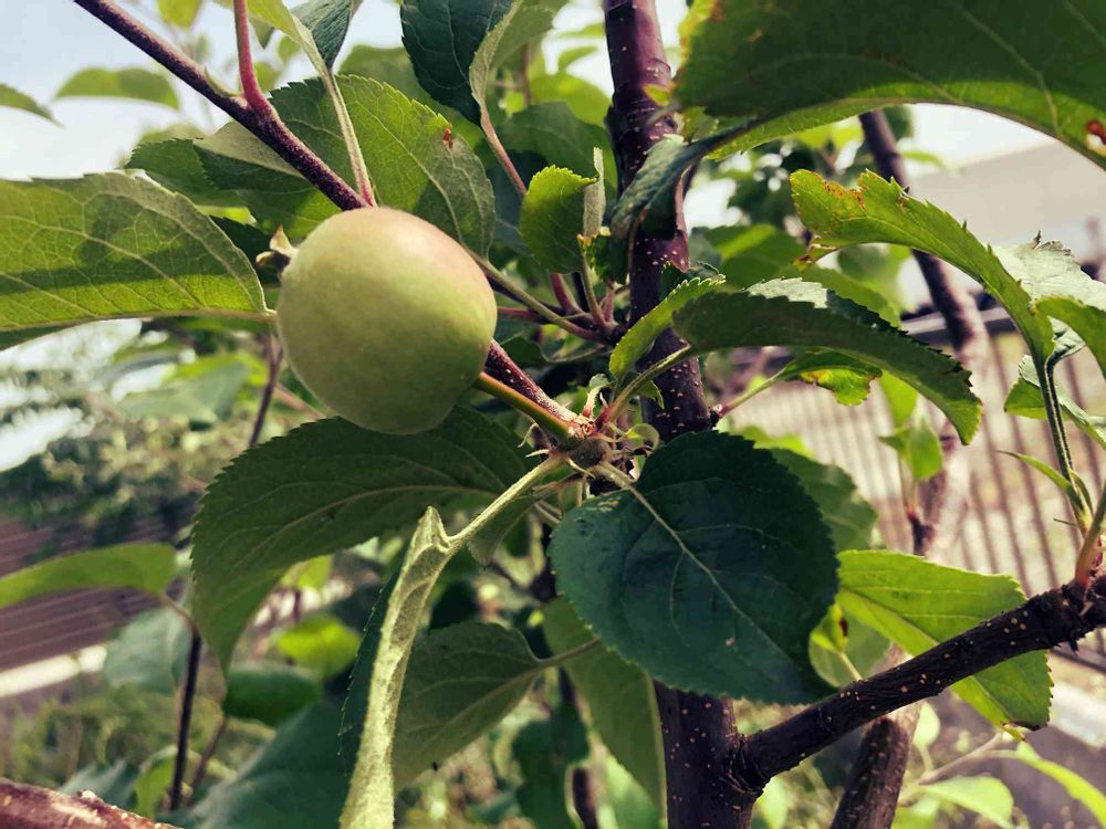 数年前に植えたりんごに この春初めて花が咲き、なんと実が膨らんできた。うわあああ、うれしい…!
