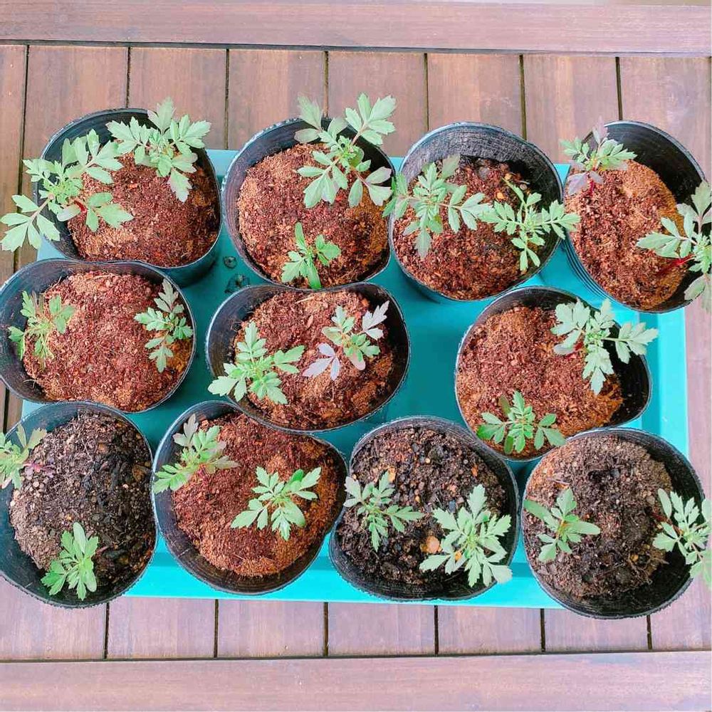 たまごパックで育てていたマリーゴールドが大きく成長したので、外のポットへ移しました🌱✨