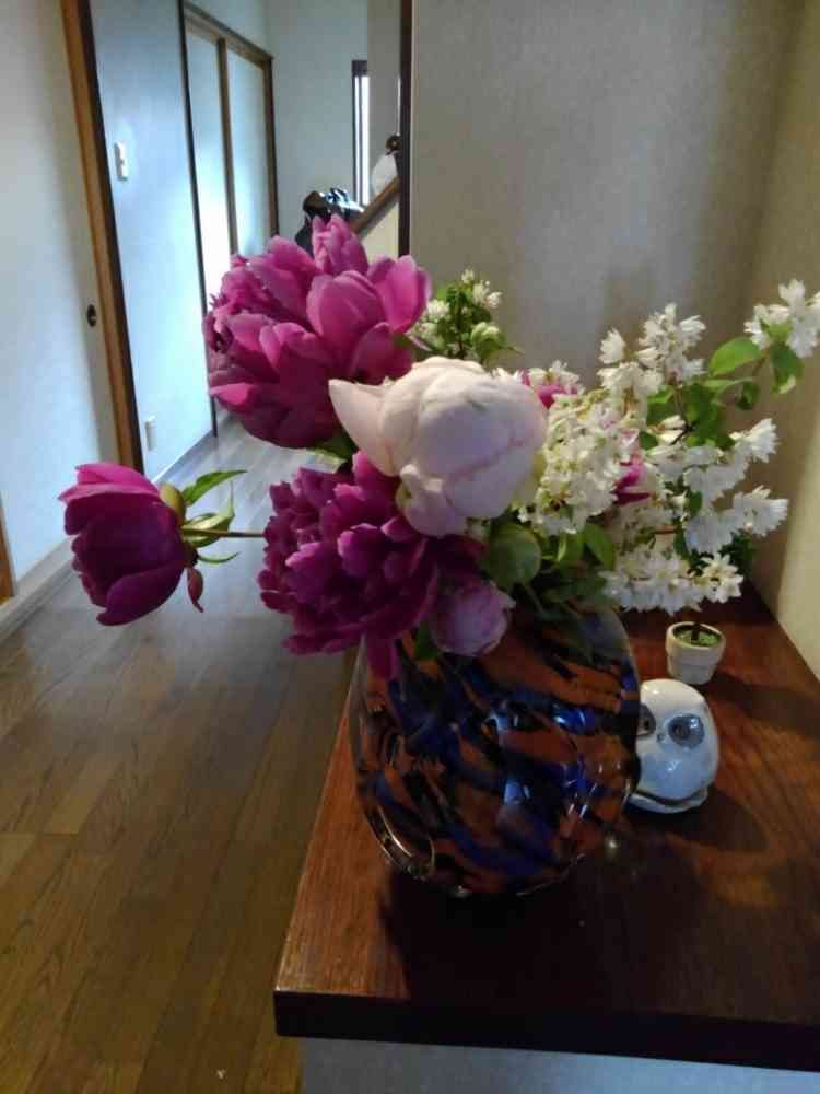 当たり前ですが。外の芍薬、開ききってます。残り少ない蕾、開いてても、なんとか大丈夫な芍薬、そしてうつぎ。もっと早く、家の中に入れれば良かった。