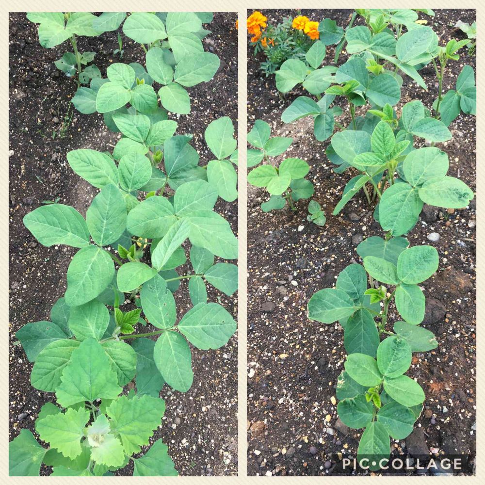 どちらも茶豆(たぶん品種は違う)なんだけど最初、右の苗で植えた方が育ってたのに種から蒔いた左の方がぐんぐん伸びて葉も大きくなった。不思議。
