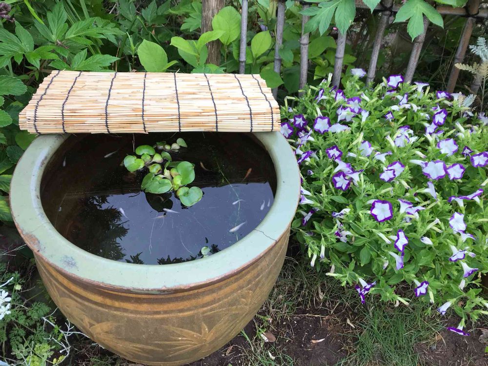 知人からメダカをいただき🤗これから暑くなるので槇の木の下に壺を置き🌱ヨシズは、100均😅ホテイアオイもっと買って来ようかなぁ🤗隣のお花江戸しぼり🌿✨なんか風情あるかも🌿✨
