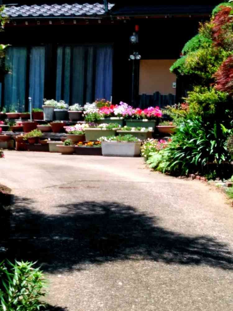みさと公園の近くのお宅の、門からの🤳です。玄関前に、お花が沢山置かれていました。