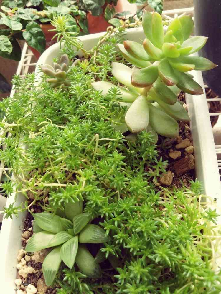 一番手前のハオルチアは花鏡、セダムは森村万年草、左奥のは秋麗でしょうか?
