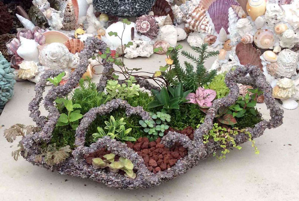 貝殻と砂利を樹脂で固めていろいろな鉢を作っています。 また、ロックウールを使った誰もが簡単にできる寄せ植えを紹介しています。