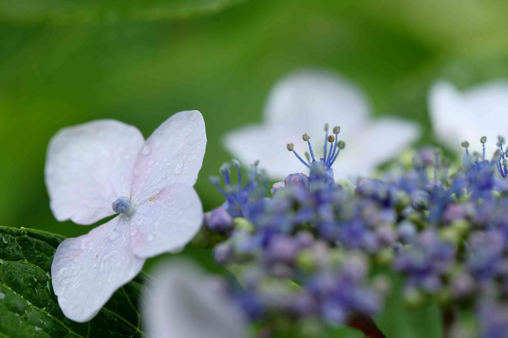 今朝の我が家のガクアジサイ。雨が少し降っていましたが、シットリ濡れてアジサイによく似合いますね。遠目では周りの花びらだけが目立ちますが、よく見ると真ん中の部分もツンツンしてきした。
